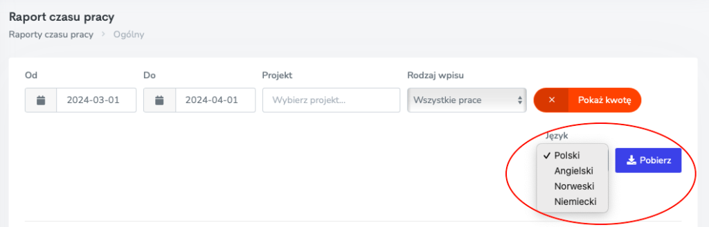 Teraz wystarczy, że wybierzesz preferowany język, w którym chcesz otrzymać raport, a następnie klikniesz przycisk „pobierz”. To proste i efektywne rozwiązanie, które pozwoli Ci jeszcze sprawniej zarządzać czasem pracy, niezależnie od preferowanego języka.