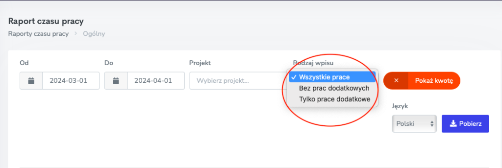 Przy dodaniu nowego rodzaju pracy, wprowadziliśmy również dodatkową funkcję — możliwość generowania raportów czasu pracy zarówno z pracami dodatkowymi, jak i bez nich.
