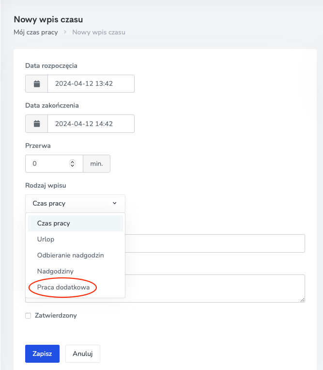 W ostatniej aktualizacji dodaliśmy nową opcję do rodzaju rozliczania czasu pracy – Prace Dodatkowe. Teraz w naszej aplikacji masz jeszcze więcej elastyczności w zarządzaniu czasem pracy. Teraz możesz wybierać spośród różnych opcji, obejmujących: standardowy czas pracy, nadgodziny, odbieranie nadgodzin, urlop, oraz nowo dodane prace dodatkowe. To rozszerzenie opcji pozwoli Ci dokładniej śledzić i raportować różnorodne formy pracy, dostosowując aplikację do indywidualnych potrzeb i realiów Twojej działalności.